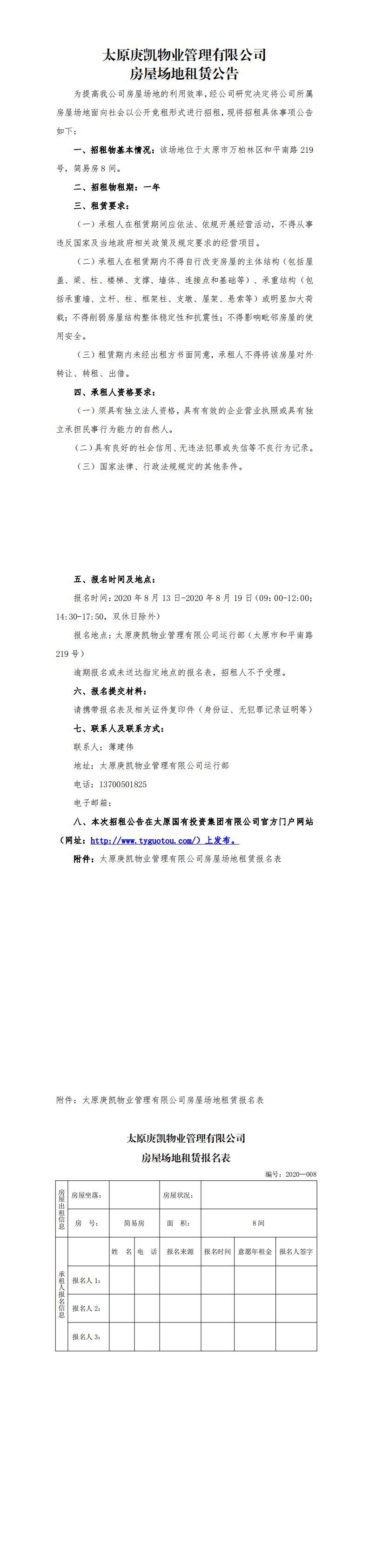 太原庚凱物業(yè)管理有限公司房屋場(chǎng)地租賃公告(八)