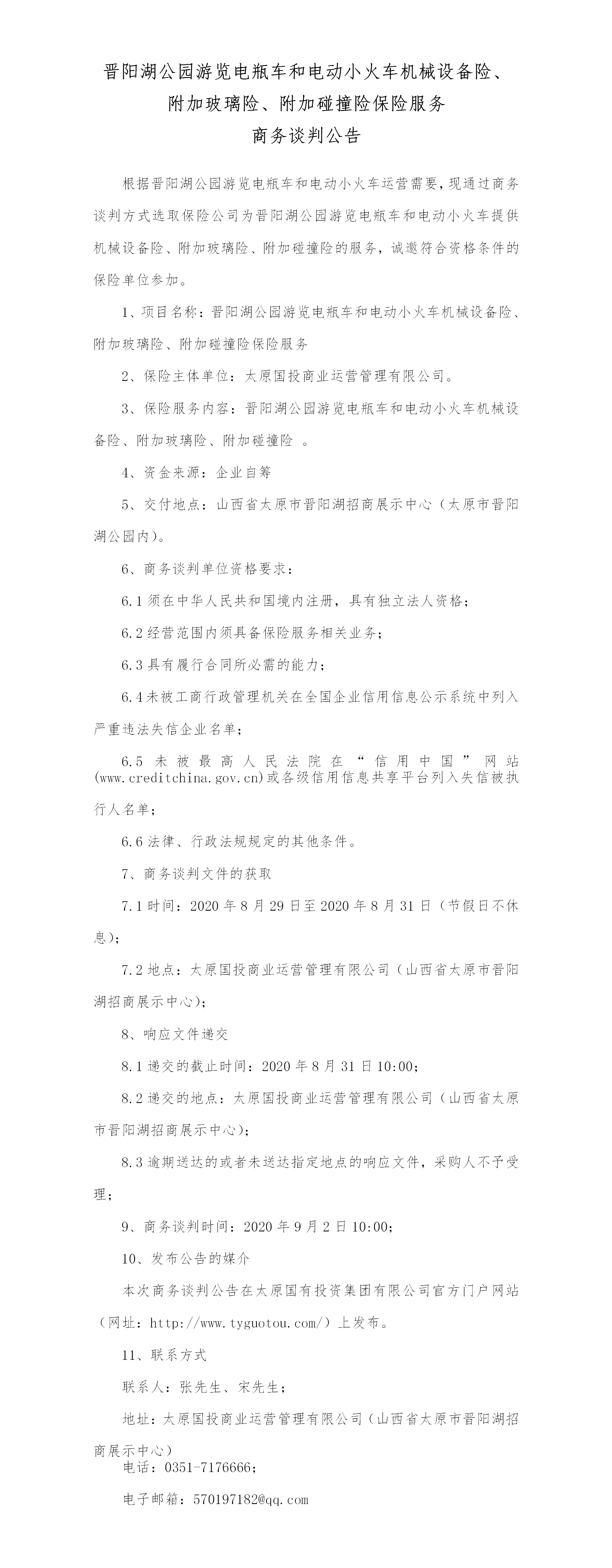 晉陽湖公園游覽電瓶車和電動小火車機械設(shè)備險、附加玻璃險、附加碰撞險保險服務商務談判公告
