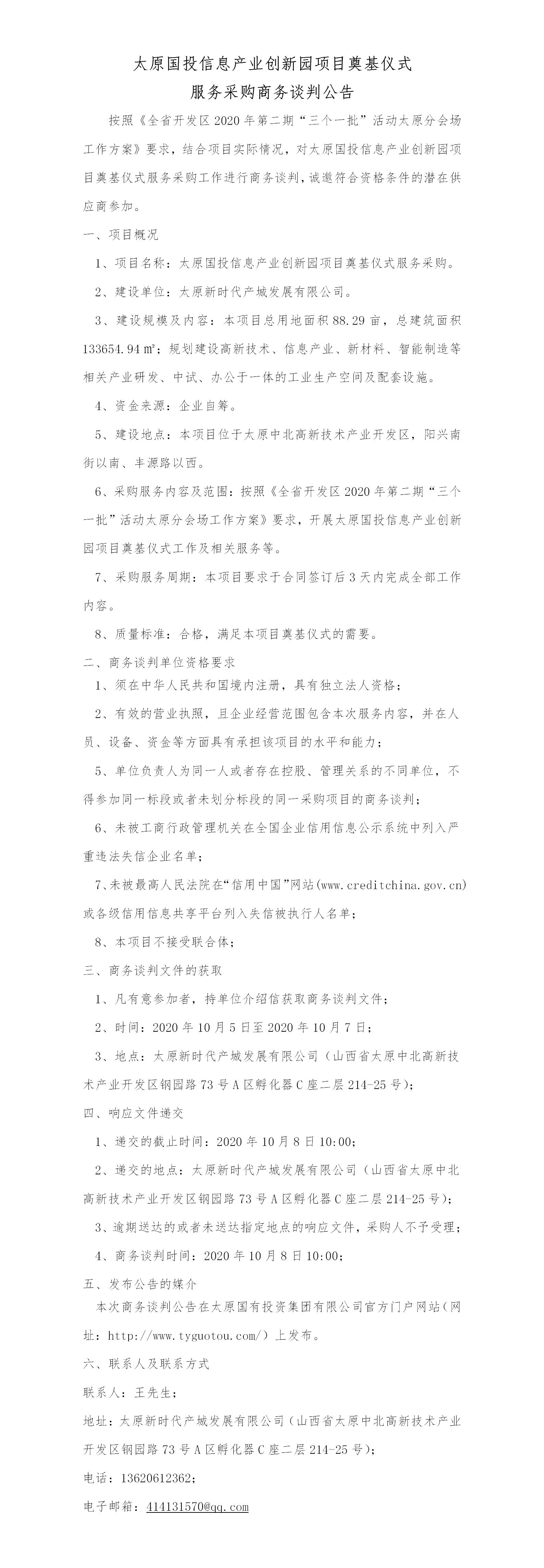 太原國投信息產(chǎn)業(yè)創(chuàng)新園項目奠基儀式服務采購商務談判公告.docx