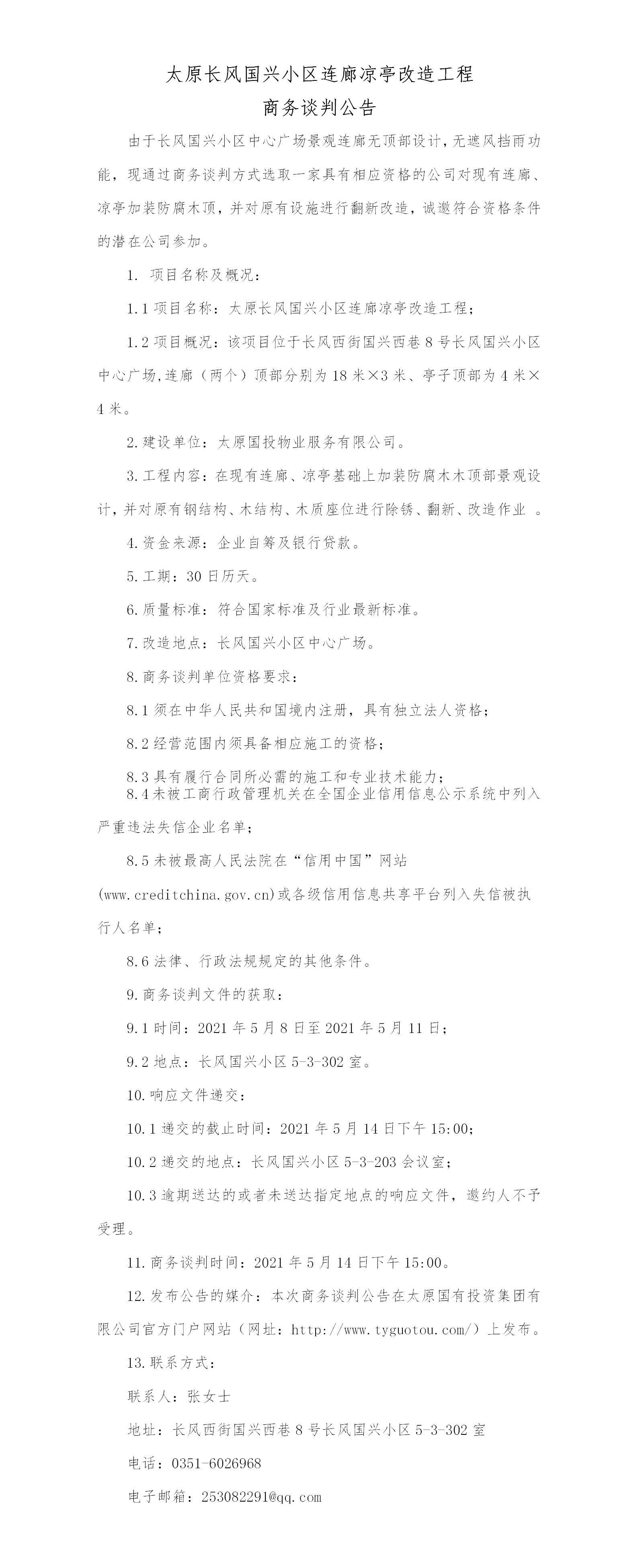 太原長風(fēng)國興小區(qū)連廊涼亭改造工程商務(wù)談判公告