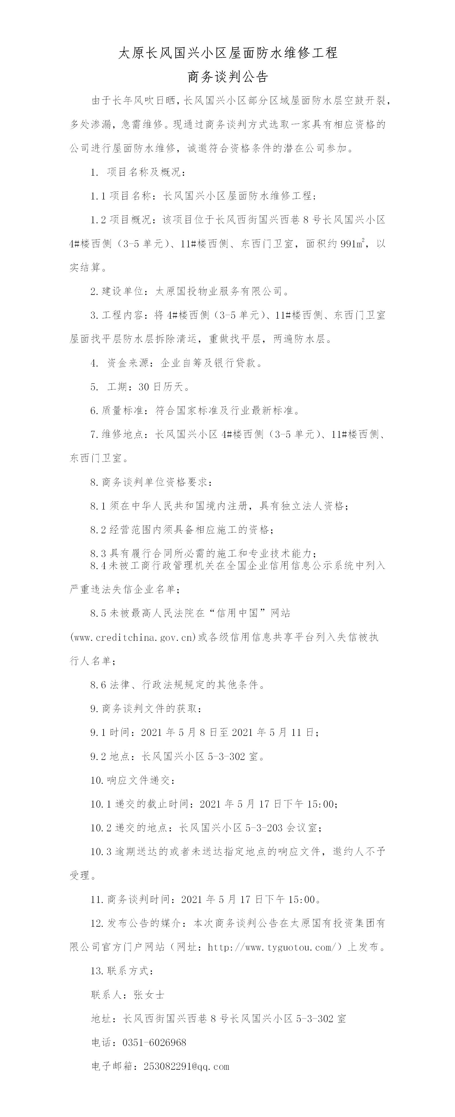 太原長(zhǎng)風(fēng)國(guó)興小區(qū)屋面防水維修工程商務(wù)談判公告