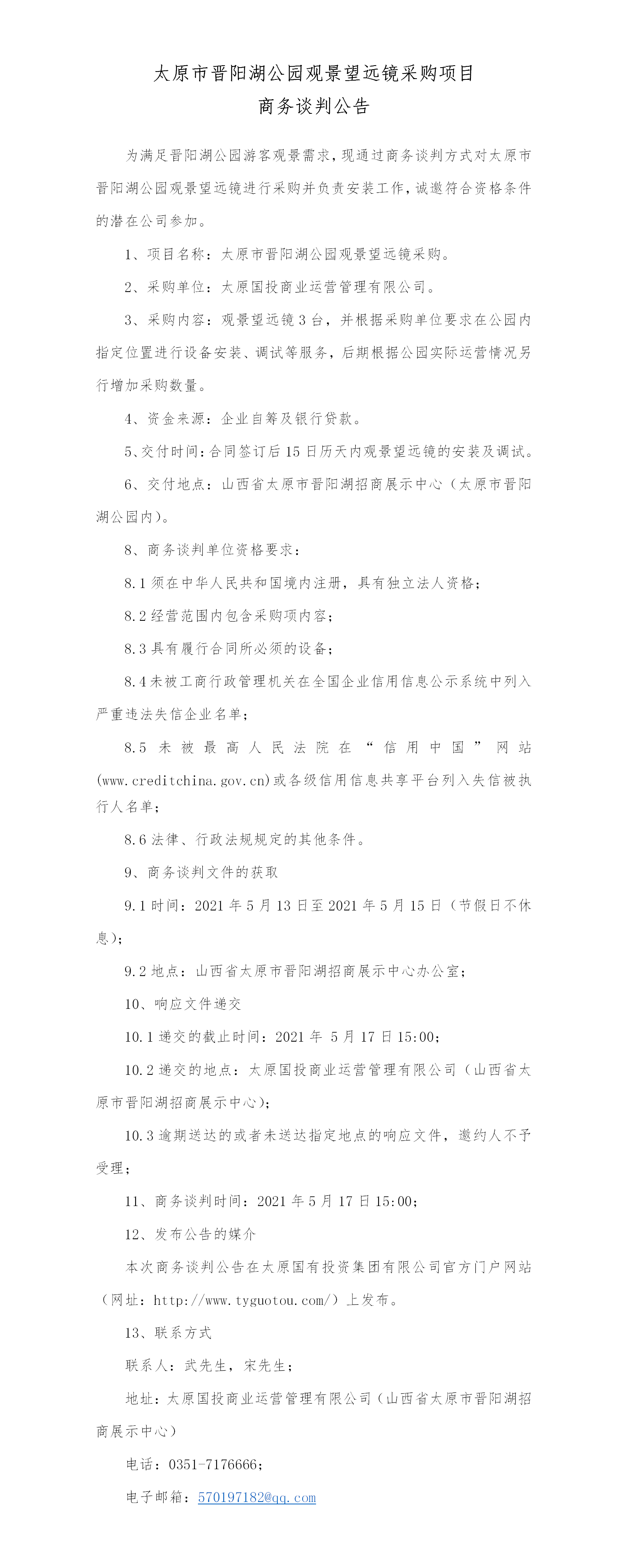 太原市晉陽湖公園觀景望遠(yuǎn)鏡采購及安裝商務(wù)談判公告
