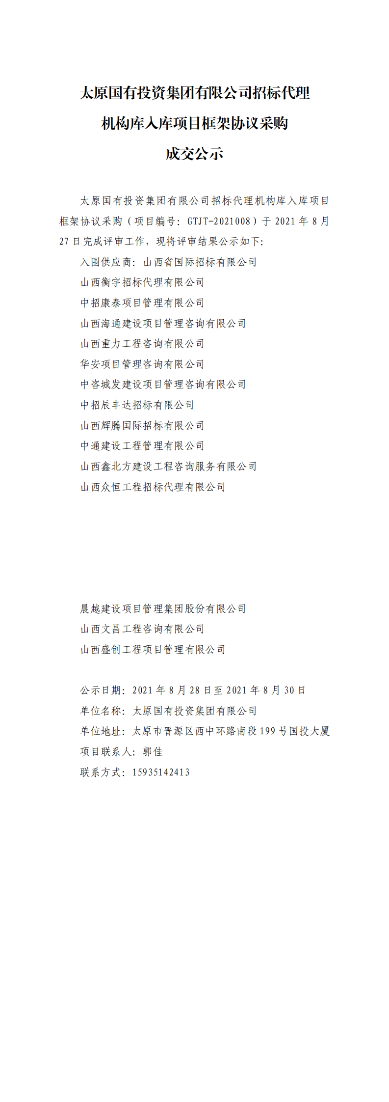 太原國有投資集團有限公司招標(biāo)代理機構(gòu)庫入庫項目框架協(xié)議采購成交公示