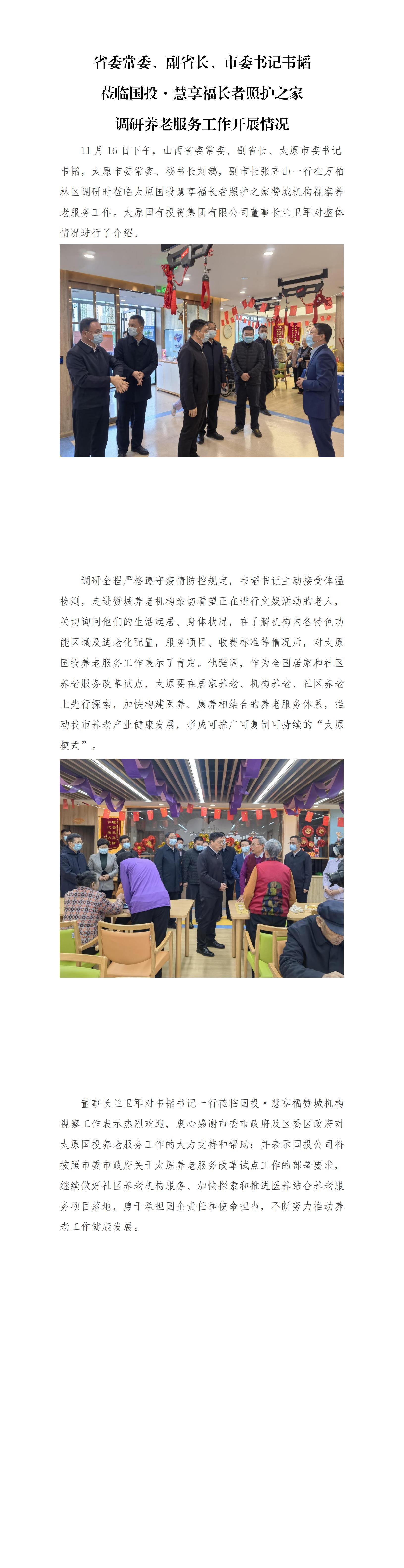 省委常委、副省長(zhǎng)、市委書(shū)記韋韜蒞臨國(guó)投·慧享福長(zhǎng)者照護(hù)之家調(diào)研養(yǎng)老服務(wù)工作開(kāi)展情況