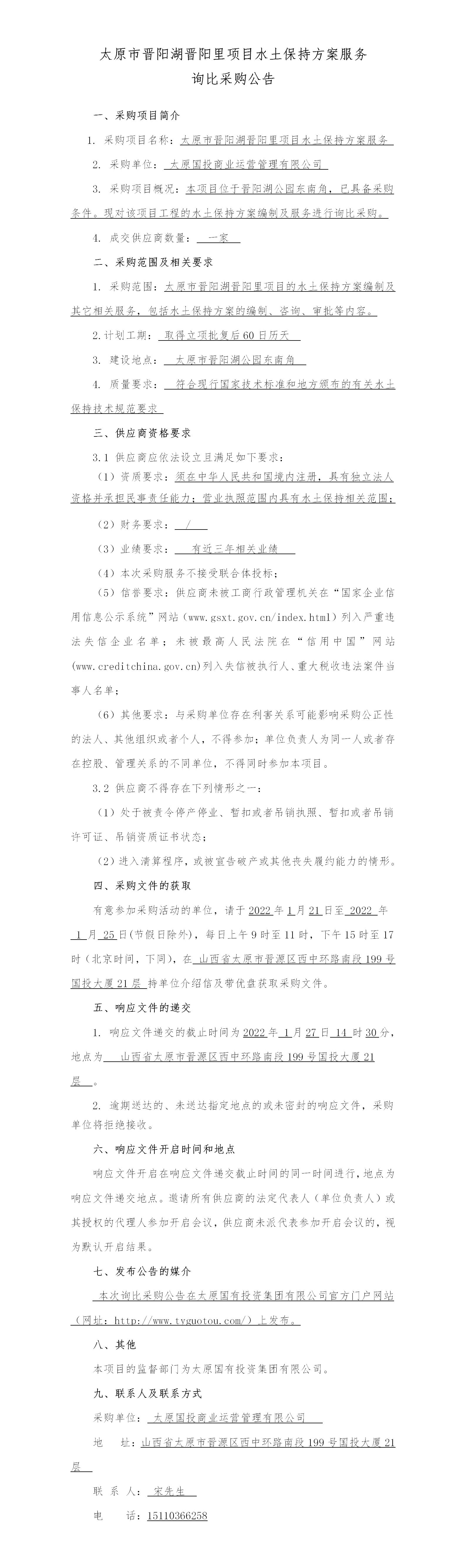 太原市晉陽湖晉陽里項目水土保持方案服務(wù)詢比采購公告