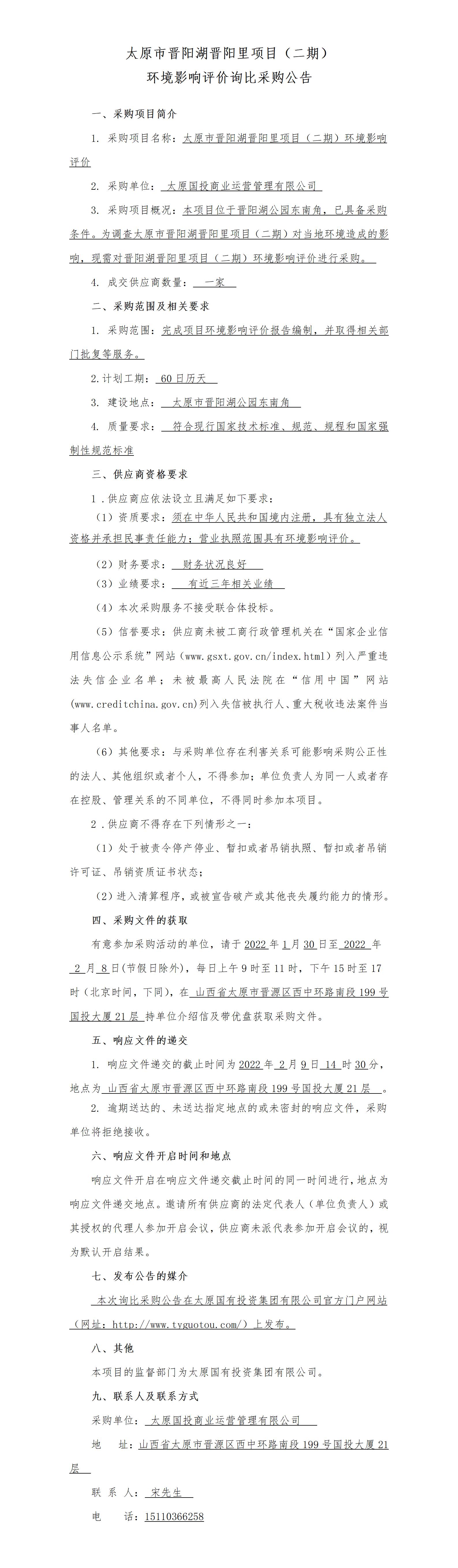 太原市晉陽湖晉陽里項目(二期)環(huán)境影響評價詢比采購公告