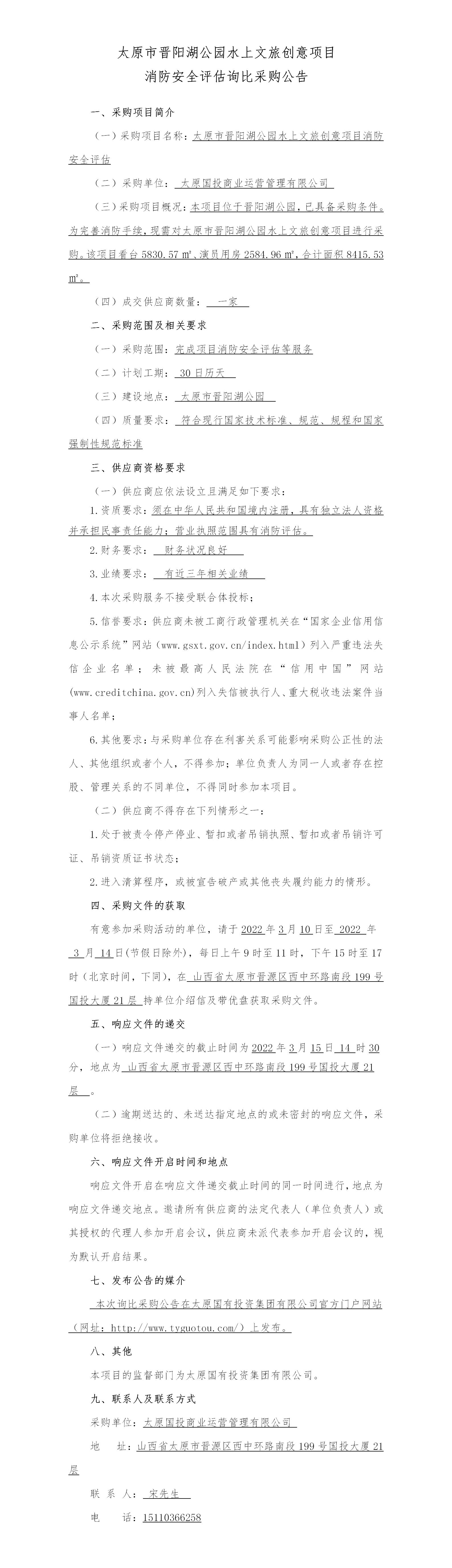 太原市晉陽湖公園水上文旅創(chuàng)意項目消防安全評估詢比采購公告