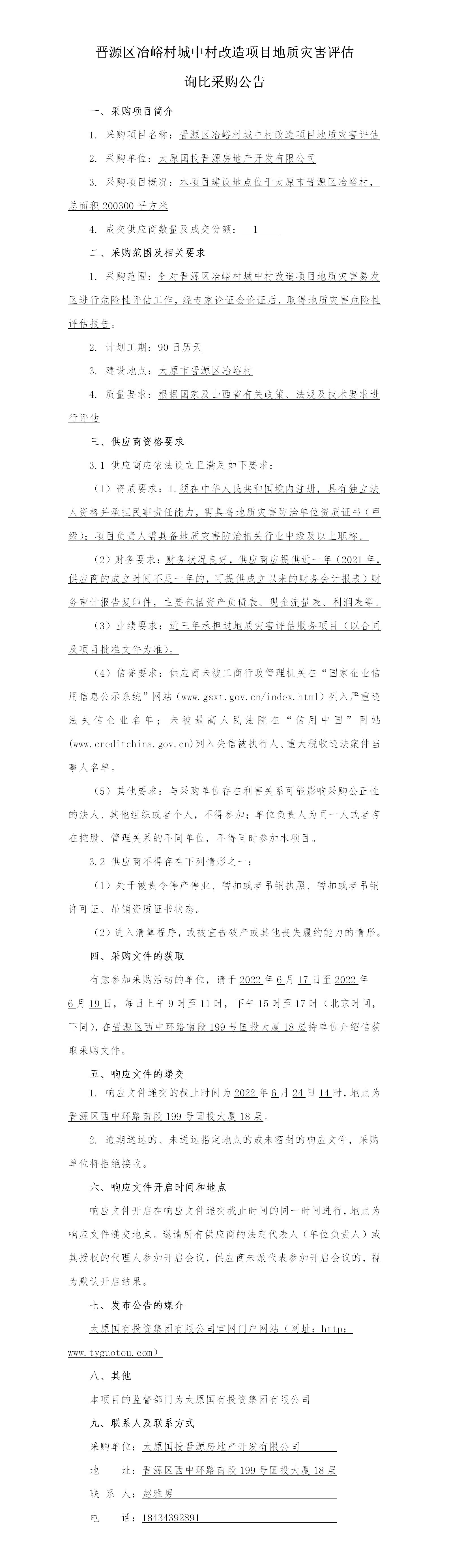 晉源區(qū)冶峪村城中村改造項(xiàng)目地質(zhì)災(zāi)害評估詢比采購公告