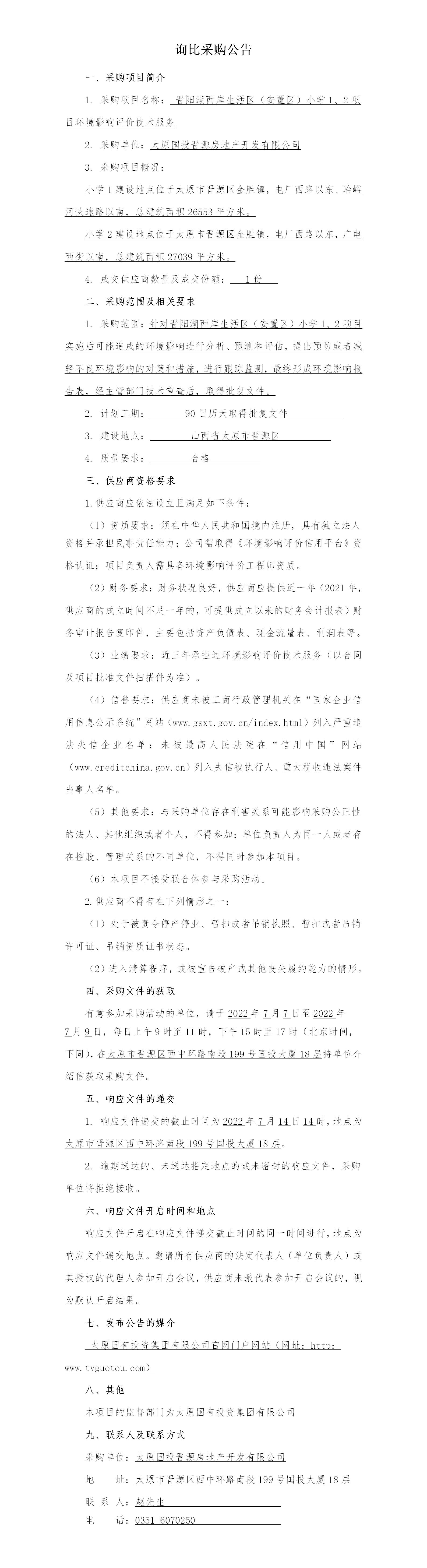 晉陽(yáng)湖西岸生活區(qū)(安置區(qū))小學(xué)1、2項(xiàng)目環(huán)境影響評(píng)價(jià)技術(shù)服務(wù)詢(xún)比采購(gòu)公告