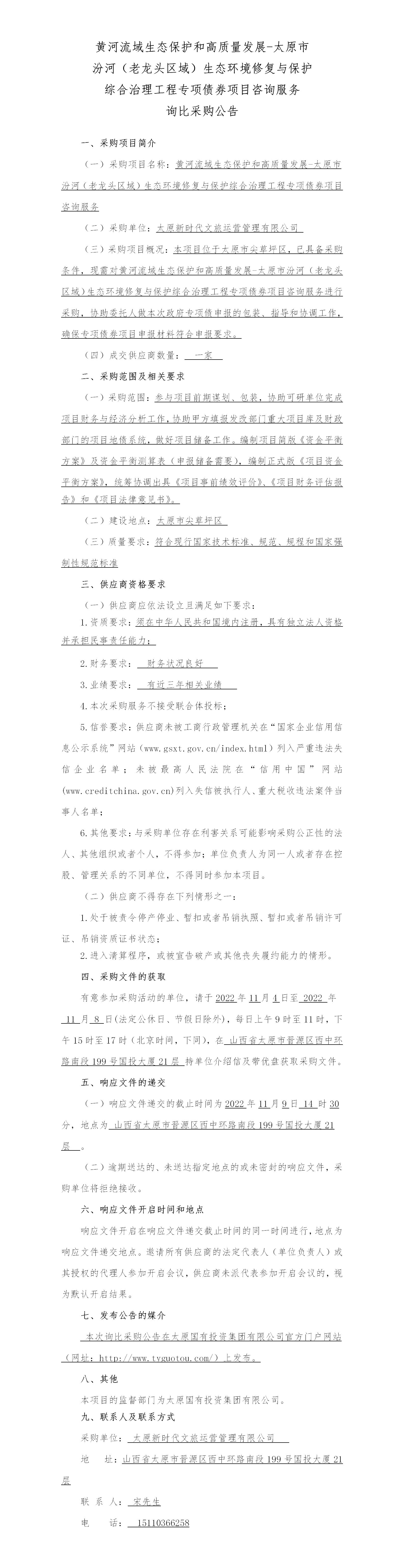 黃河流域生態(tài)保護(hù)和高質(zhì)量發(fā)展-太原市汾河(老龍頭區(qū)域)生態(tài)環(huán)境修復(fù)與保護(hù)綜合治理工程專項(xiàng)債券項(xiàng)目咨詢服務(wù)詢比采購(gòu)公告