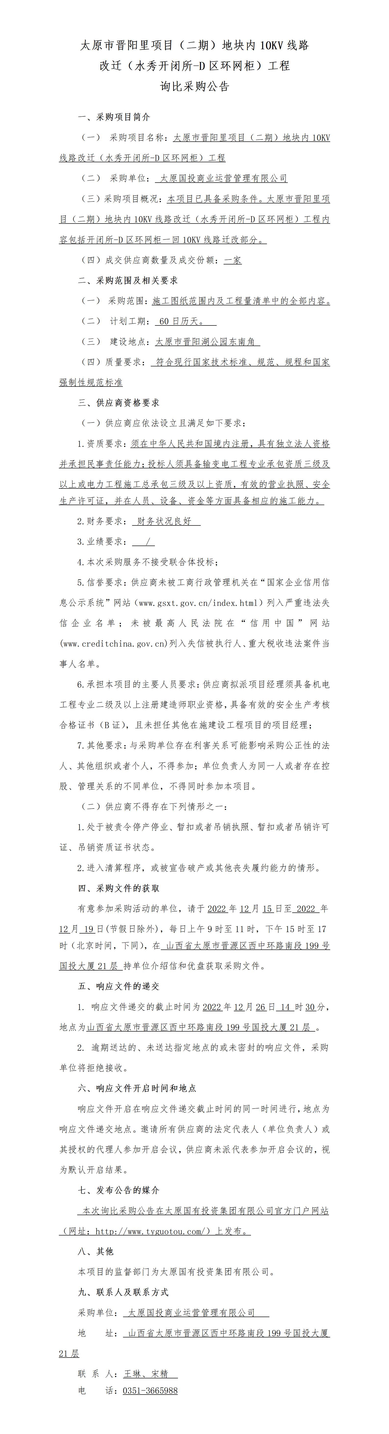 太原市晉陽里項目(二期)地塊內(nèi)10KV線路改遷(水秀開閉所-D區(qū)環(huán)網(wǎng)柜)工程詢比采購公告