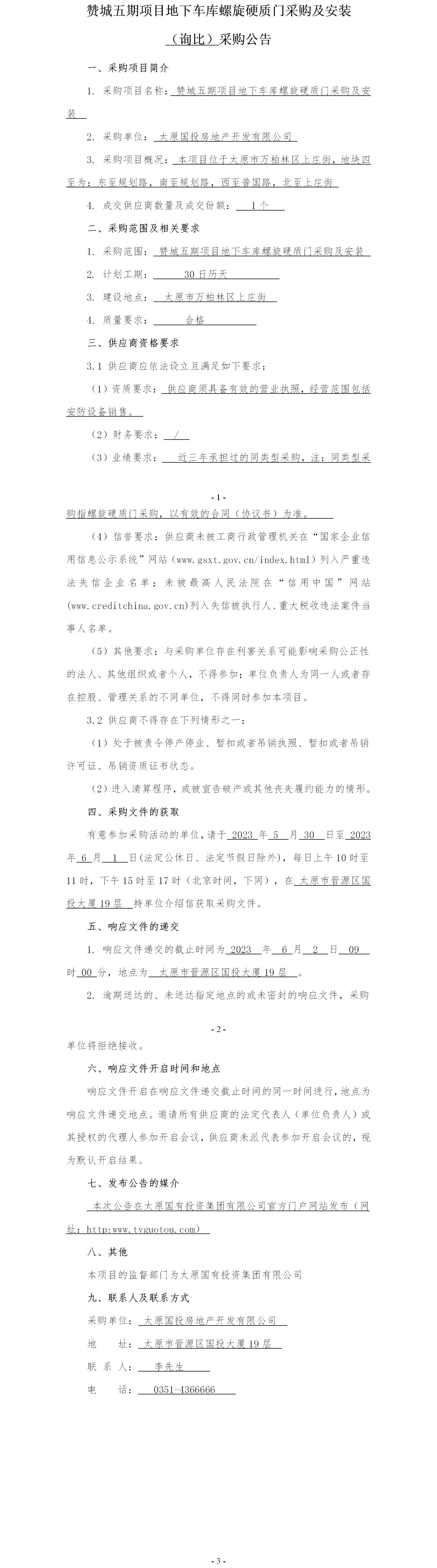 贊城五期項(xiàng)目地下車庫螺旋硬質(zhì)門采購及安裝詢比采購公告