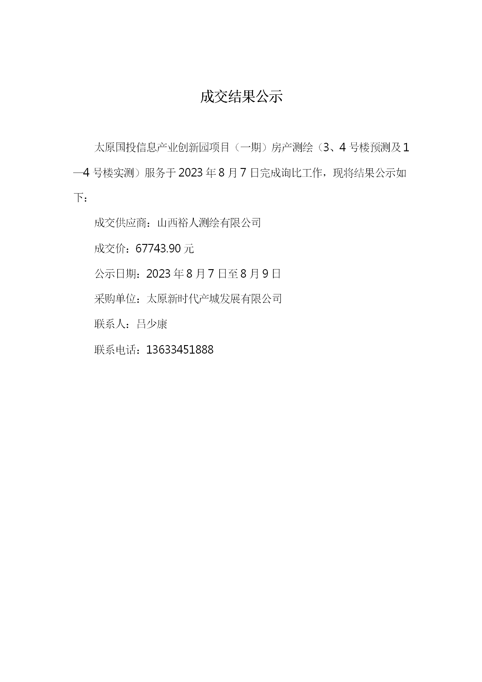 太原國投信息產(chǎn)業(yè)創(chuàng)新園項目(一期)房產(chǎn)測繪(3、4號樓預(yù)測及1-4號樓實測)服務(wù)采購詢比成交結(jié)果公示