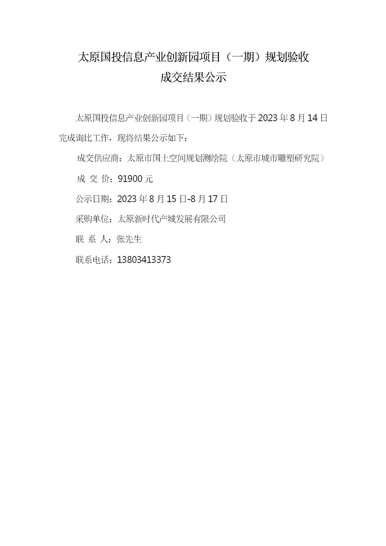太原國(guó)投信息產(chǎn)業(yè)創(chuàng)新園項(xiàng)目(一期)規(guī)劃驗(yàn)收 成交結(jié)果公示
