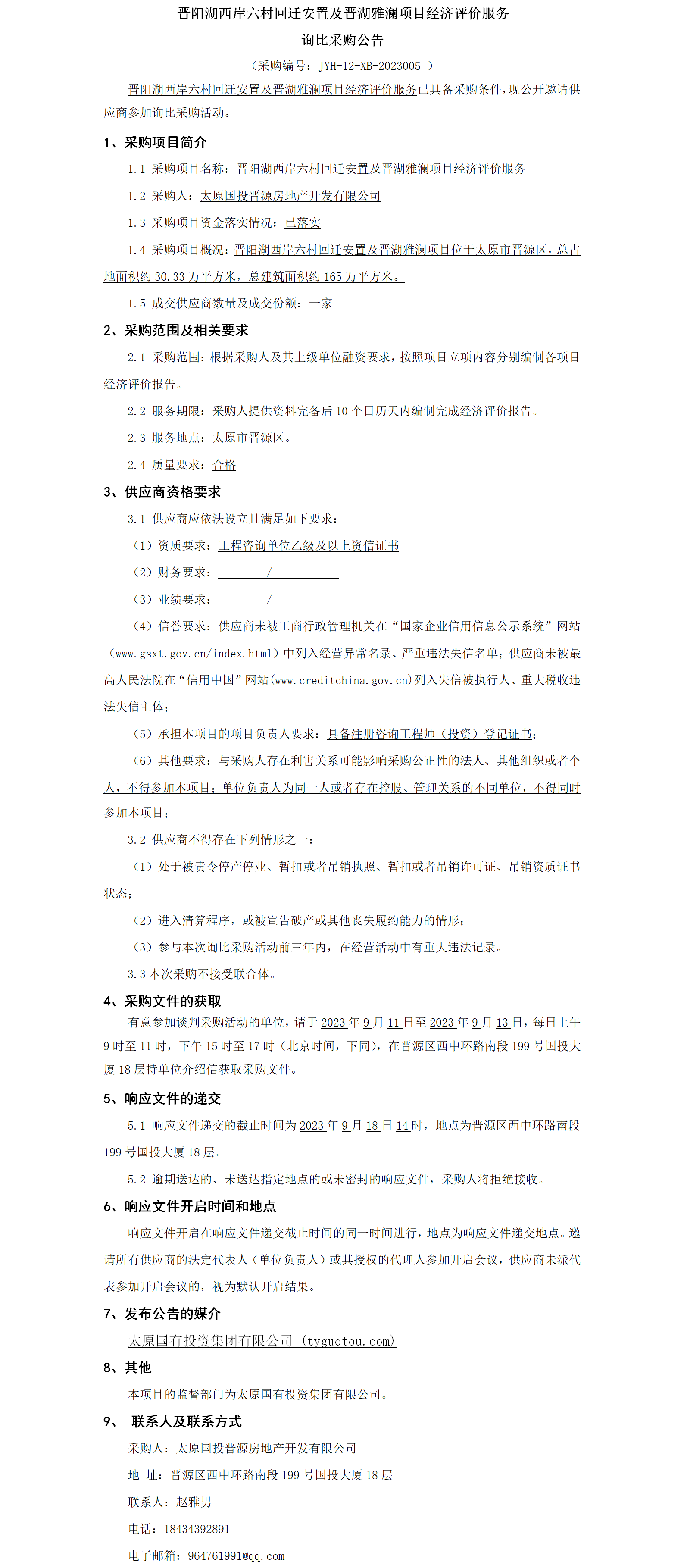 晉陽湖西岸六村回遷安置及晉湖雅瀾項目經(jīng)濟評價服務詢比采購公告