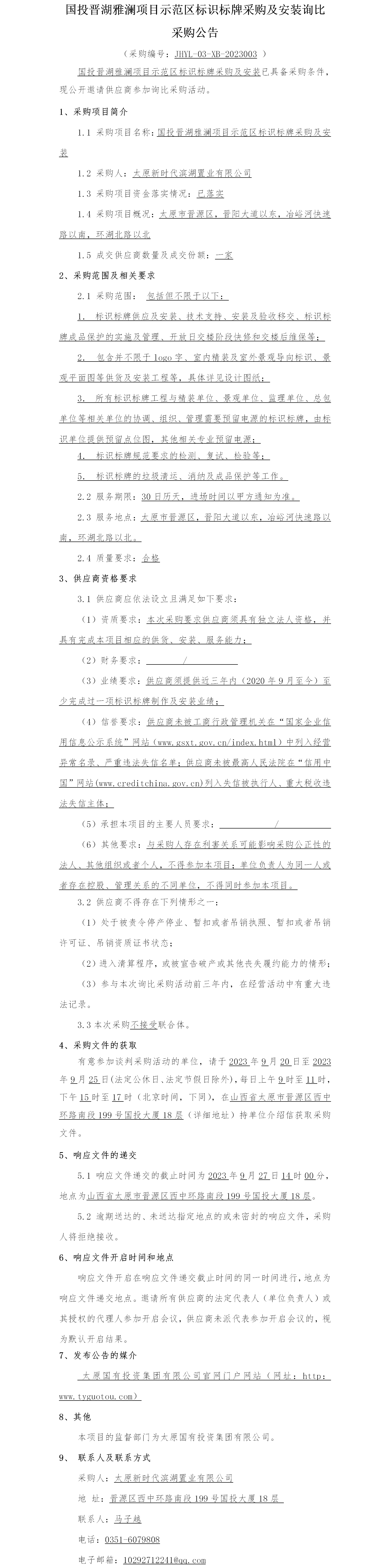 國投晉湖雅瀾項(xiàng)目示范區(qū)標(biāo)識(shí)標(biāo)牌采購及安裝詢比采購公告