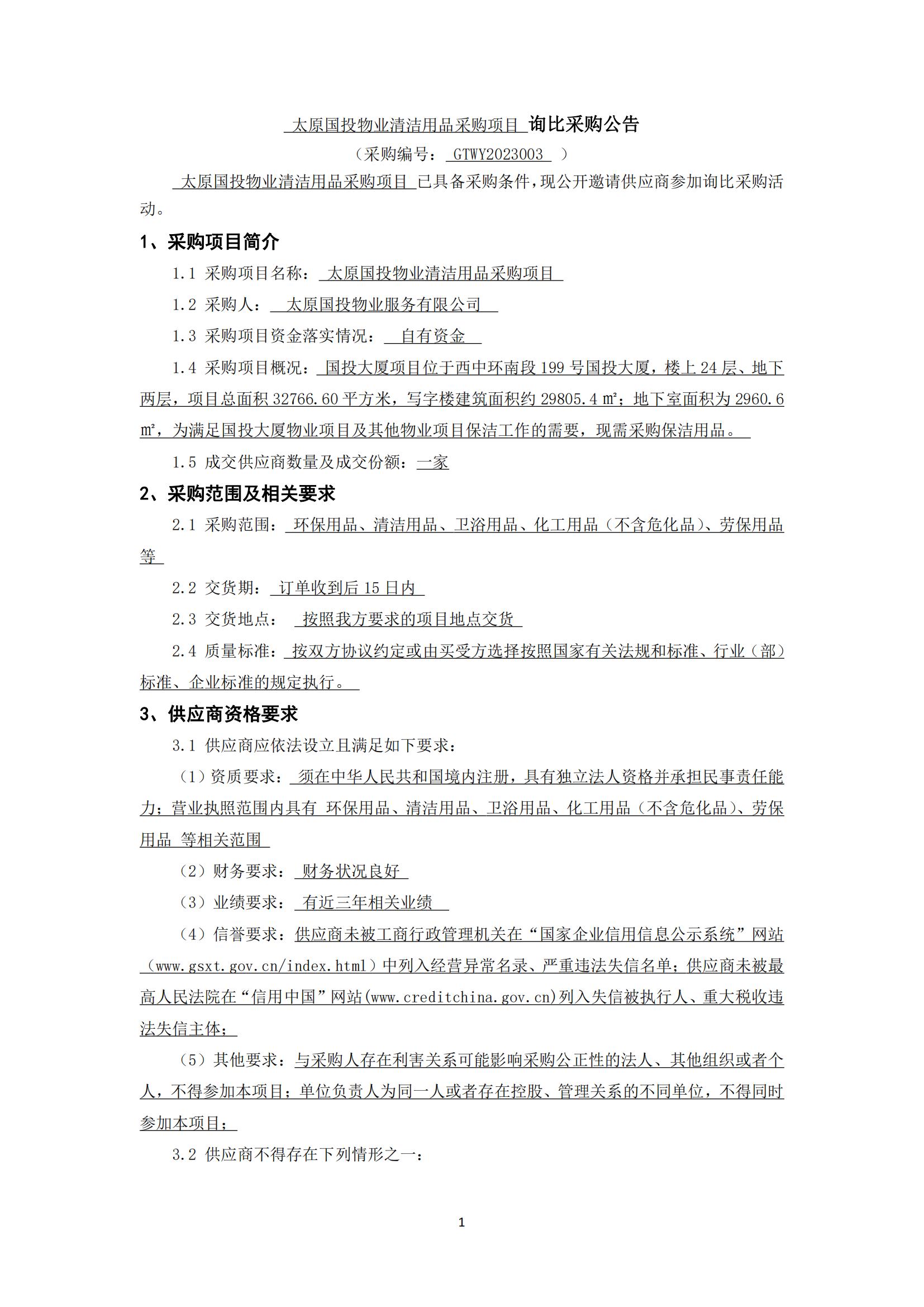 太原國投物業(yè)清潔用品采購項(xiàng)目詢比公告