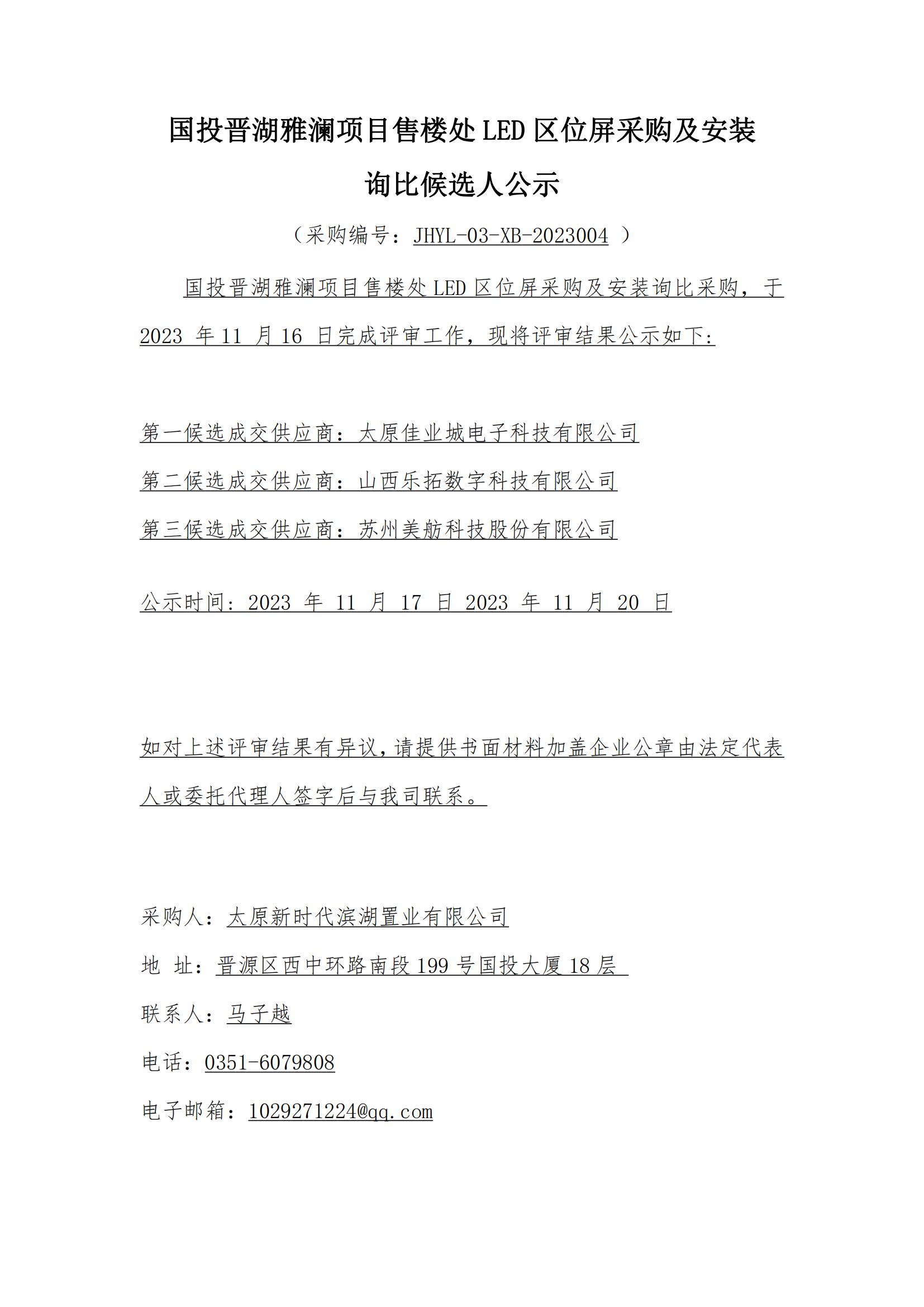 國投晉湖雅瀾項(xiàng)目售樓處LED區(qū)位屏采購及安裝詢比候選人公示