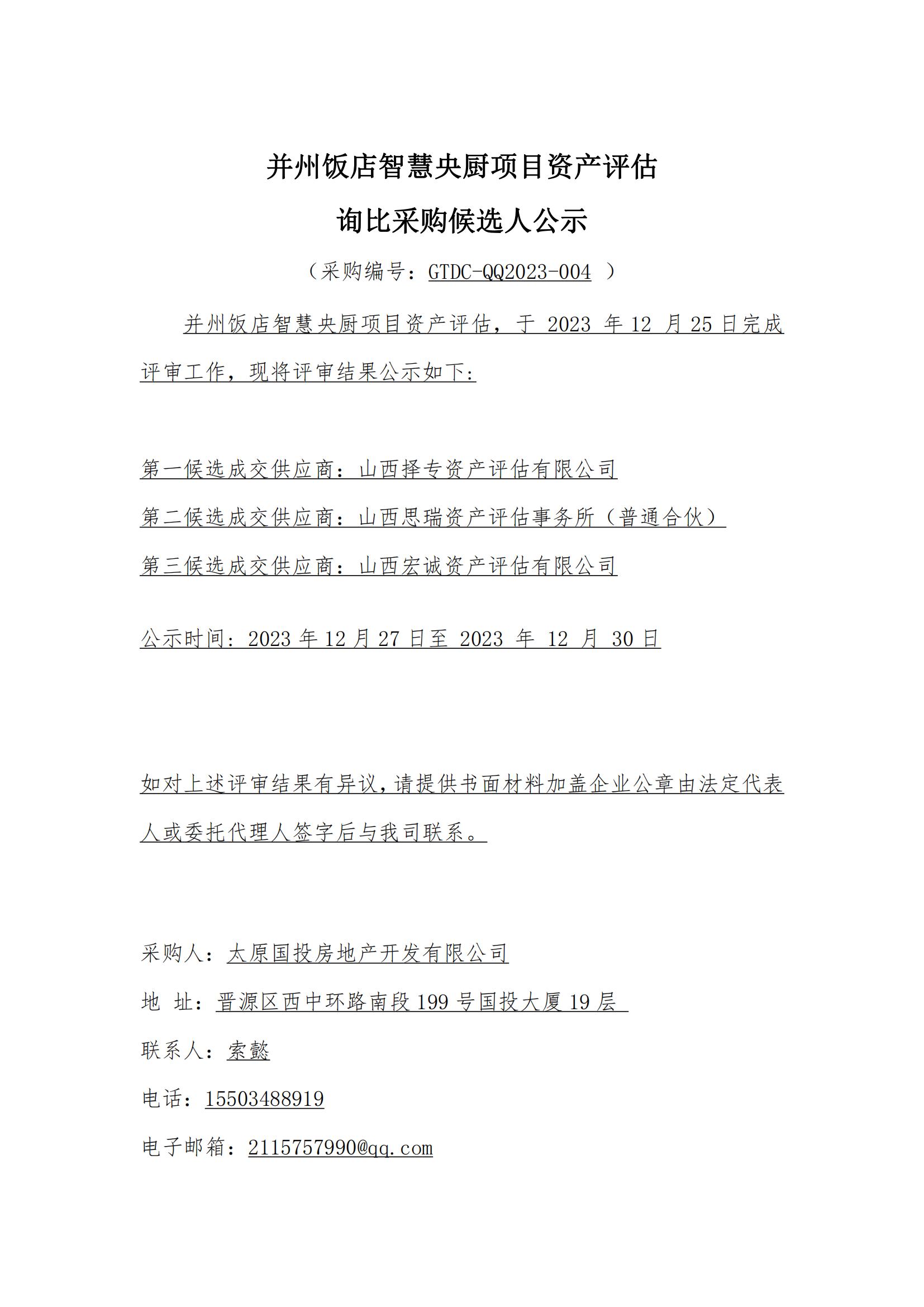 并州飯店智慧央廚項(xiàng)目資產(chǎn)評(píng)估詢比采購(gòu)候選人公示