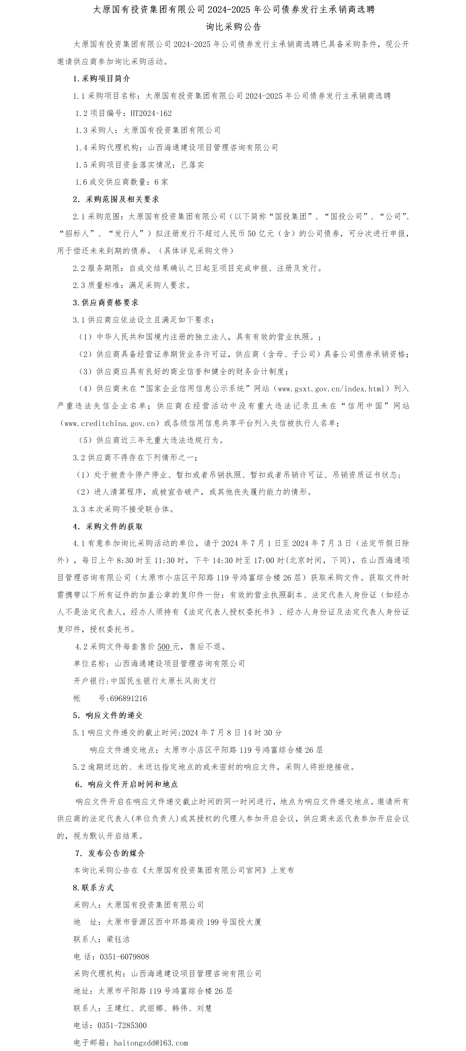太原國(guó)有投資集團(tuán)有限公司2024-2025年公司債券發(fā)行主承銷(xiāo)商選聘 詢(xún)比采購(gòu)公告