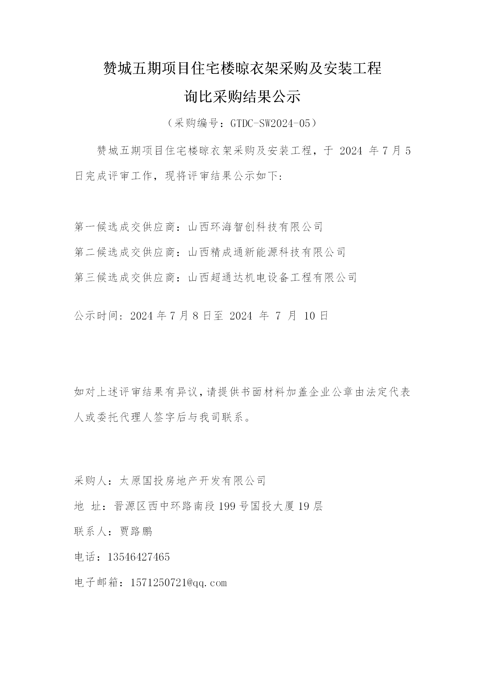 贊城五期項目住宅樓晾衣架采購及安裝工程詢比采購結果公示