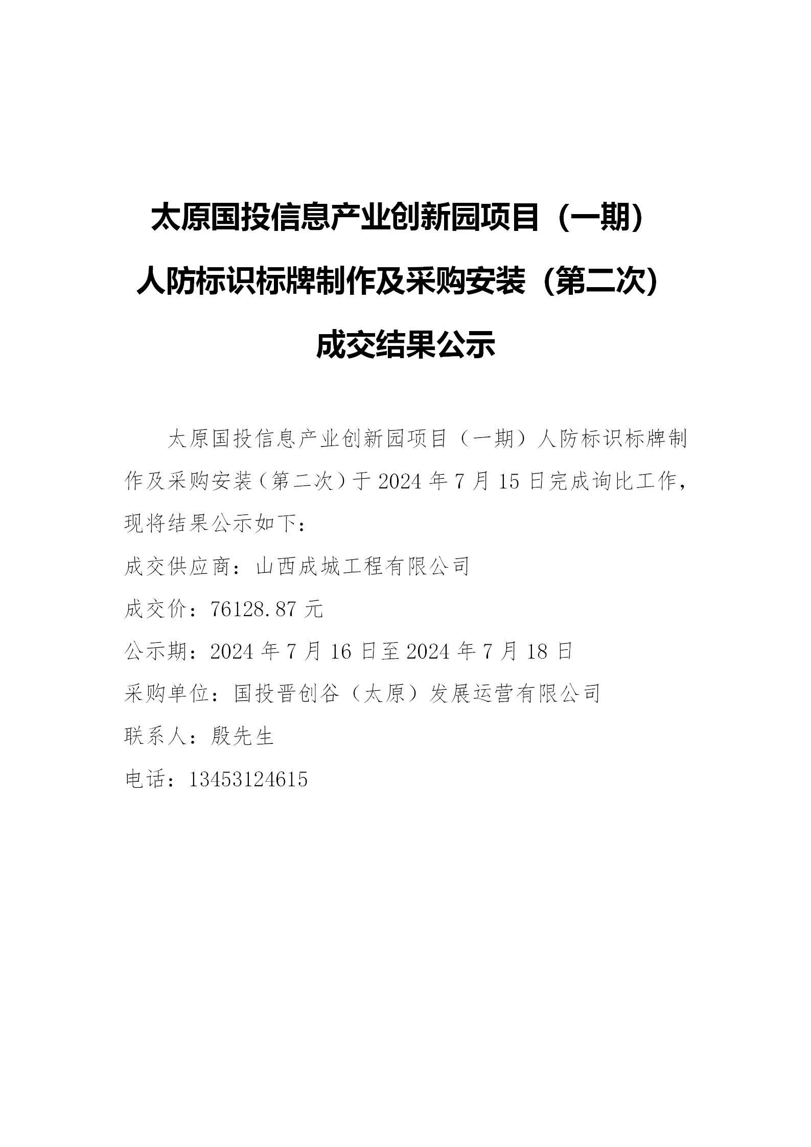 太原國投信息產(chǎn)業(yè)創(chuàng)新園項目(一期) 人防標(biāo)識標(biāo)牌制作及采購安裝(第二次) 成交結(jié)果公示