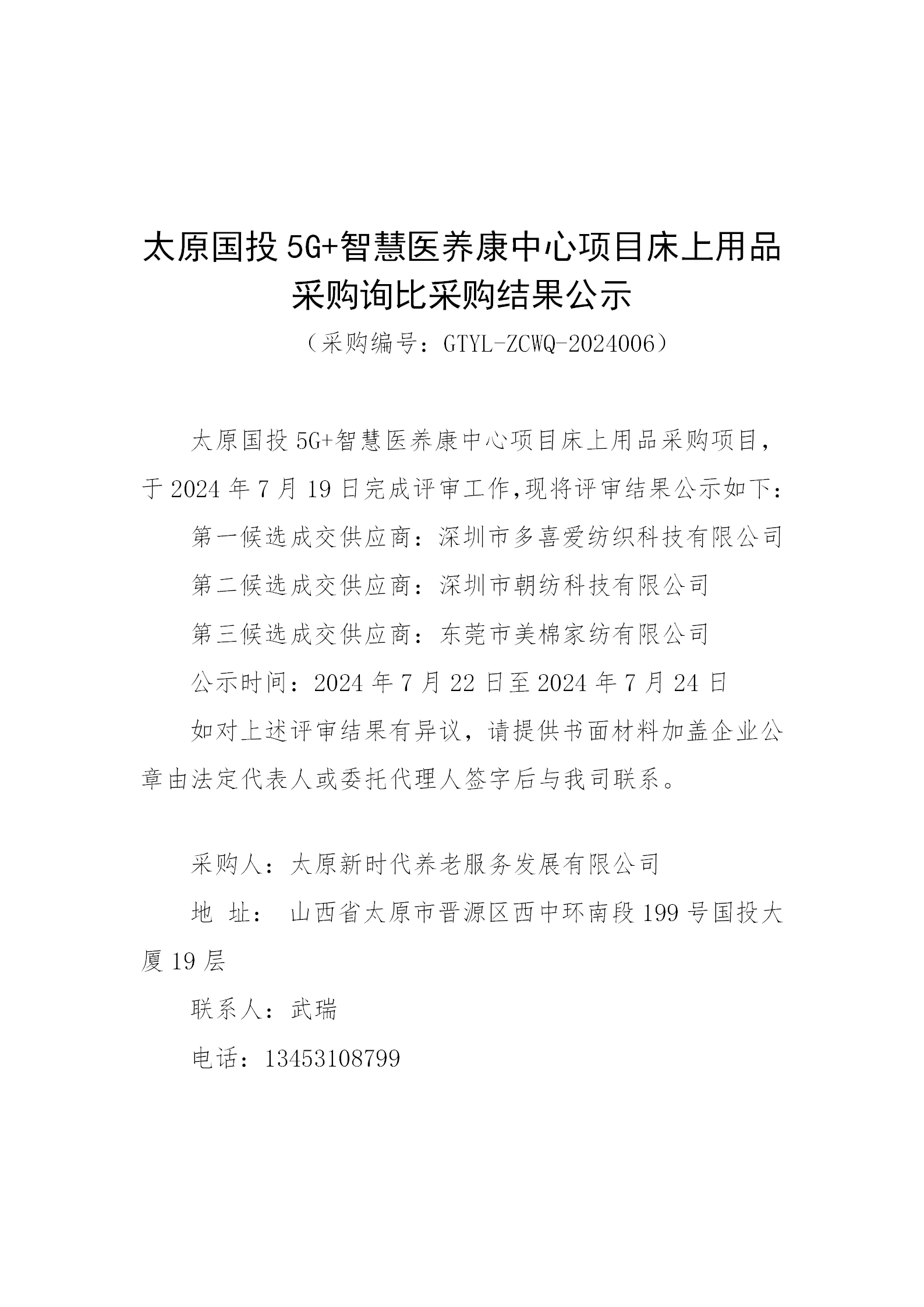 太原國投5G+智慧醫(yī)養(yǎng)康中心項目床上用品采購詢比采購結(jié)果公示