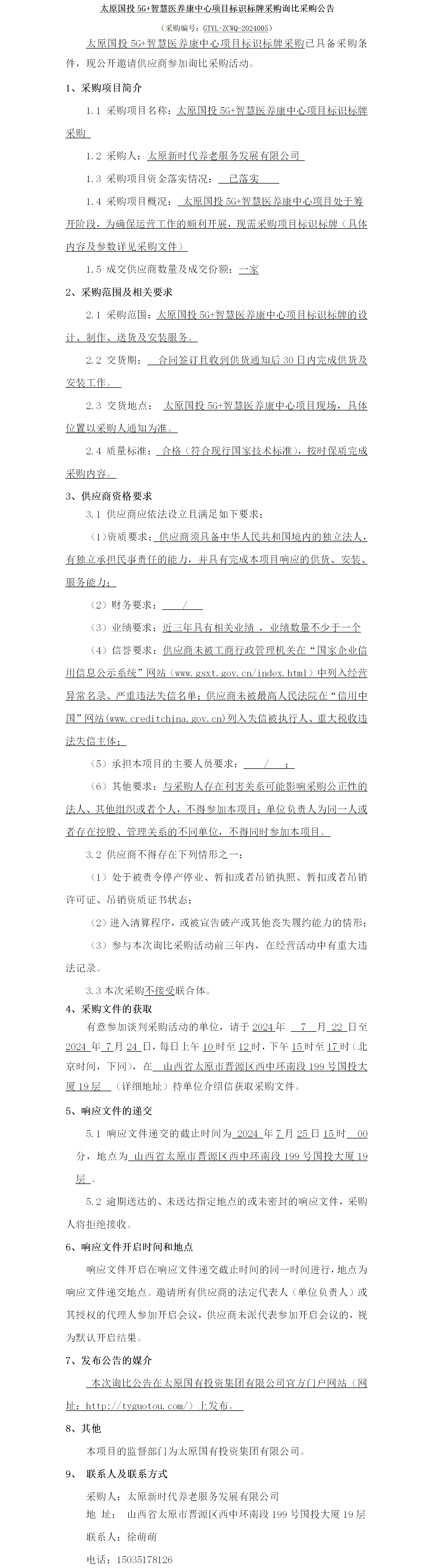 太原國投5G+智慧醫(yī)養(yǎng)康中心項目標(biāo)識標(biāo)牌采購詢比采購公告