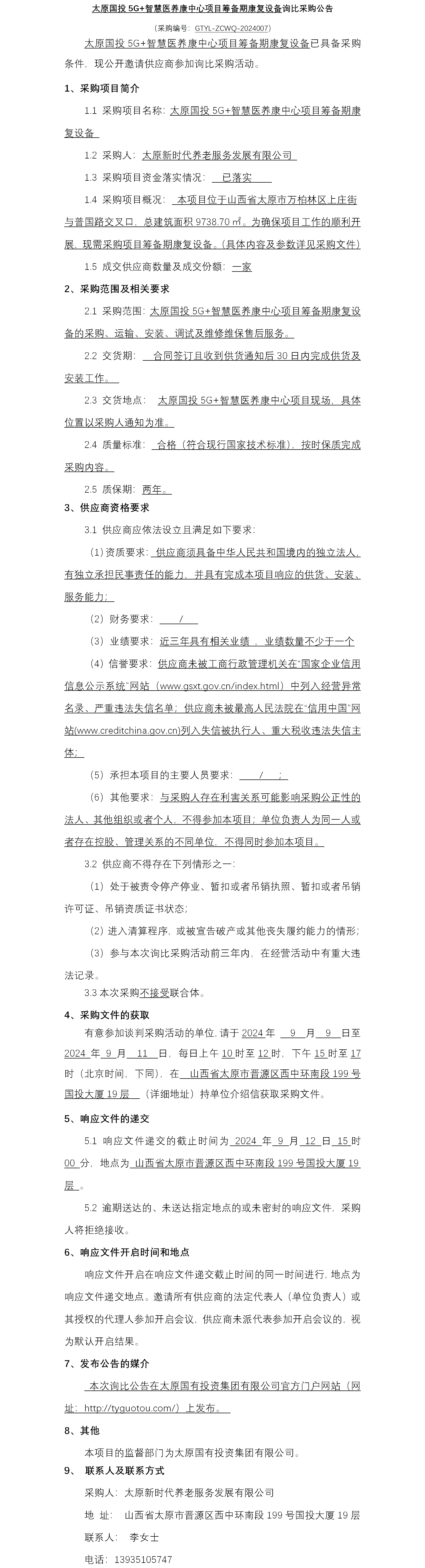 太原國投5G+智慧醫(yī)養(yǎng)康中心項(xiàng)目籌備期康復(fù)設(shè)備詢比采購公告