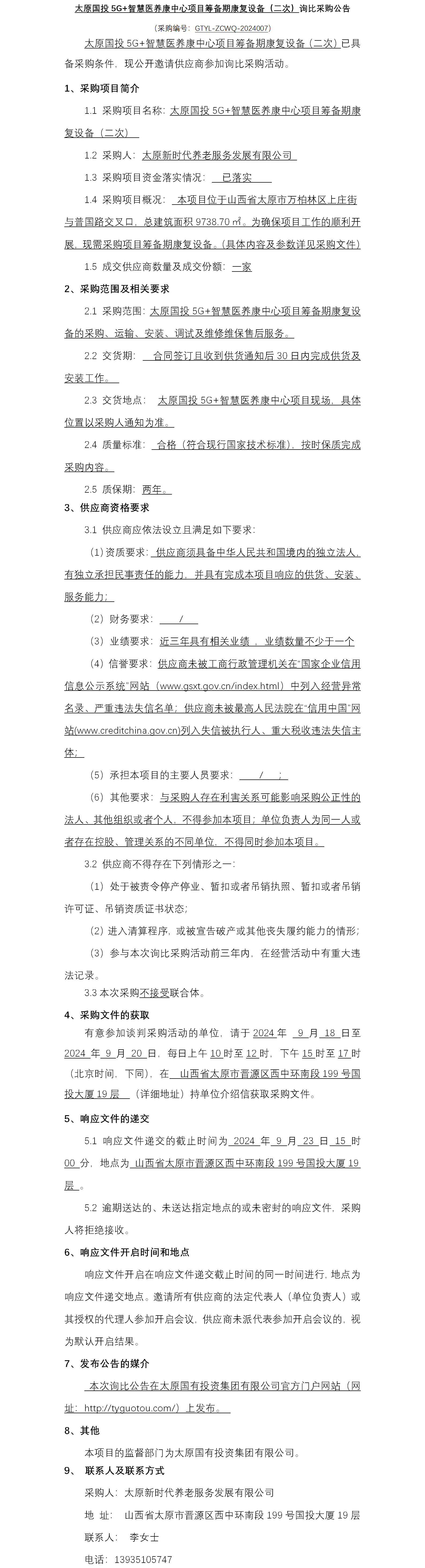 太原國投5G+智慧醫(yī)養(yǎng)康中心項目籌備期康復(fù)設(shè)備(二次)詢比采購公告