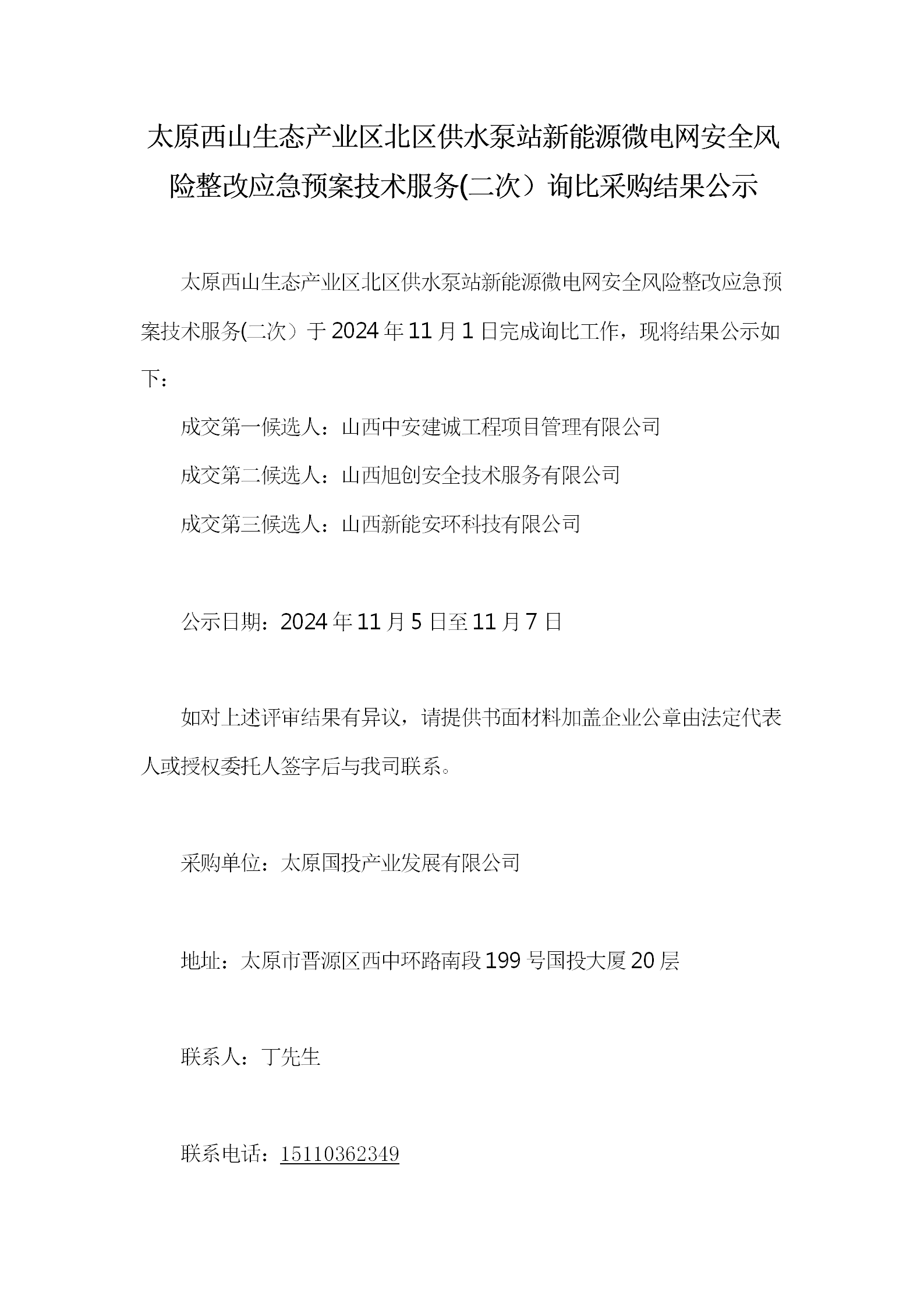 太原西山生態(tài)產業(yè)區(qū)北區(qū)供水泵站新能源微電網安全風險整改應急預案技術服務(二次)詢比采購結果公示