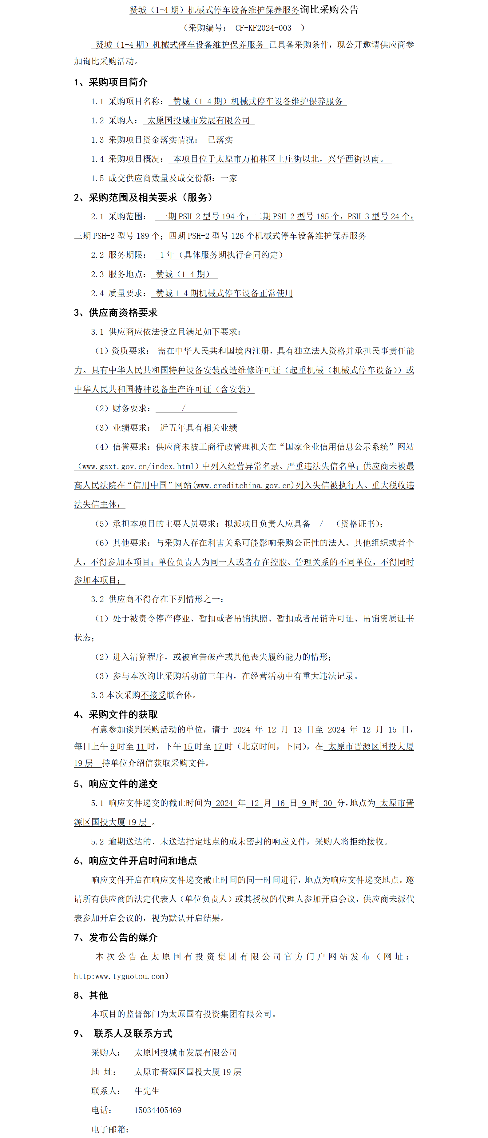贊城(1-4期)機(jī)械式停車設(shè)備維護(hù)保養(yǎng)服務(wù)詢比采購公告