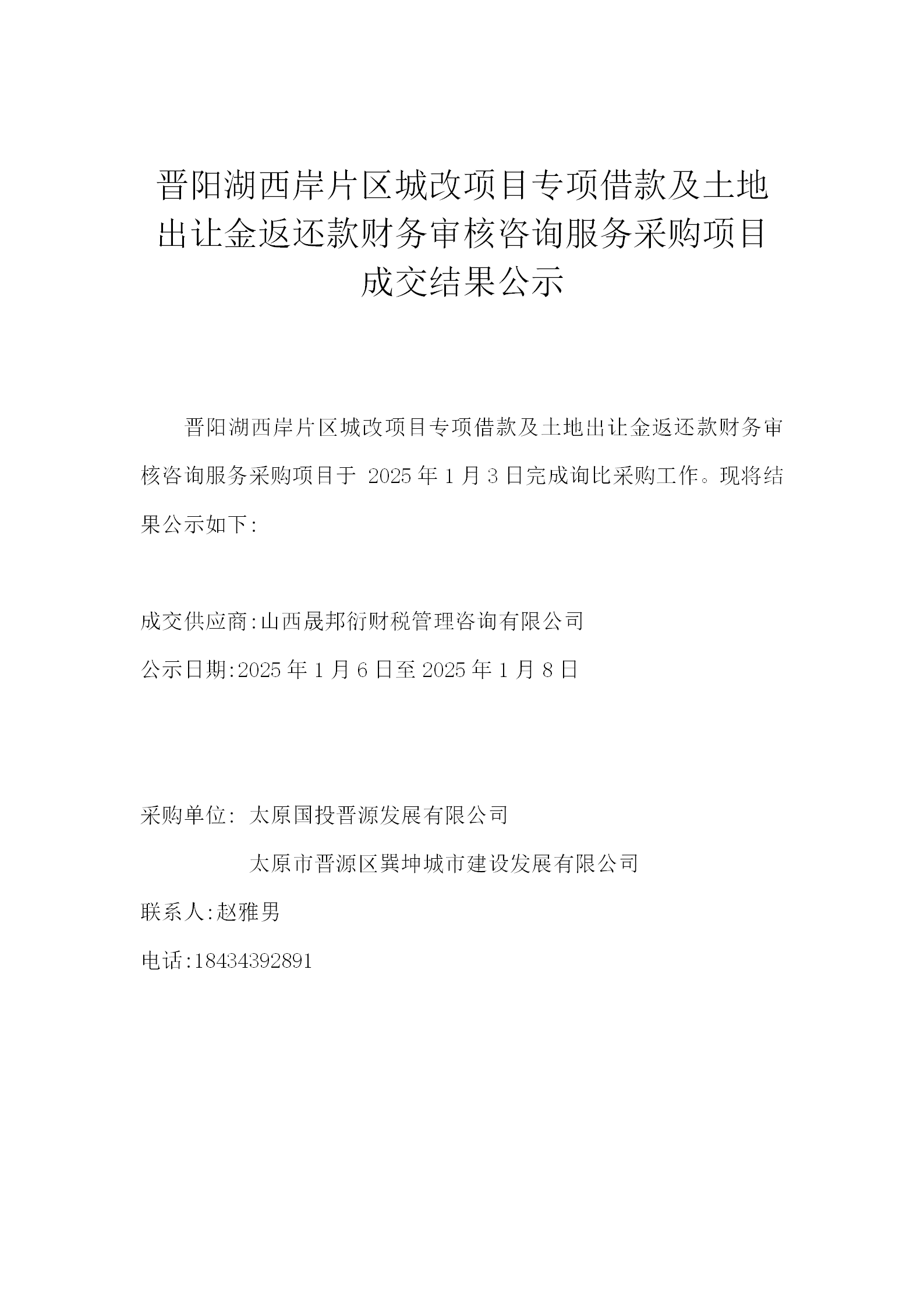 晉陽(yáng)湖西岸片區(qū)城改項(xiàng)目專項(xiàng)借款及土地出讓金返還款財(cái)務(wù)審核咨詢服務(wù)采購(gòu)項(xiàng)目結(jié)果公示