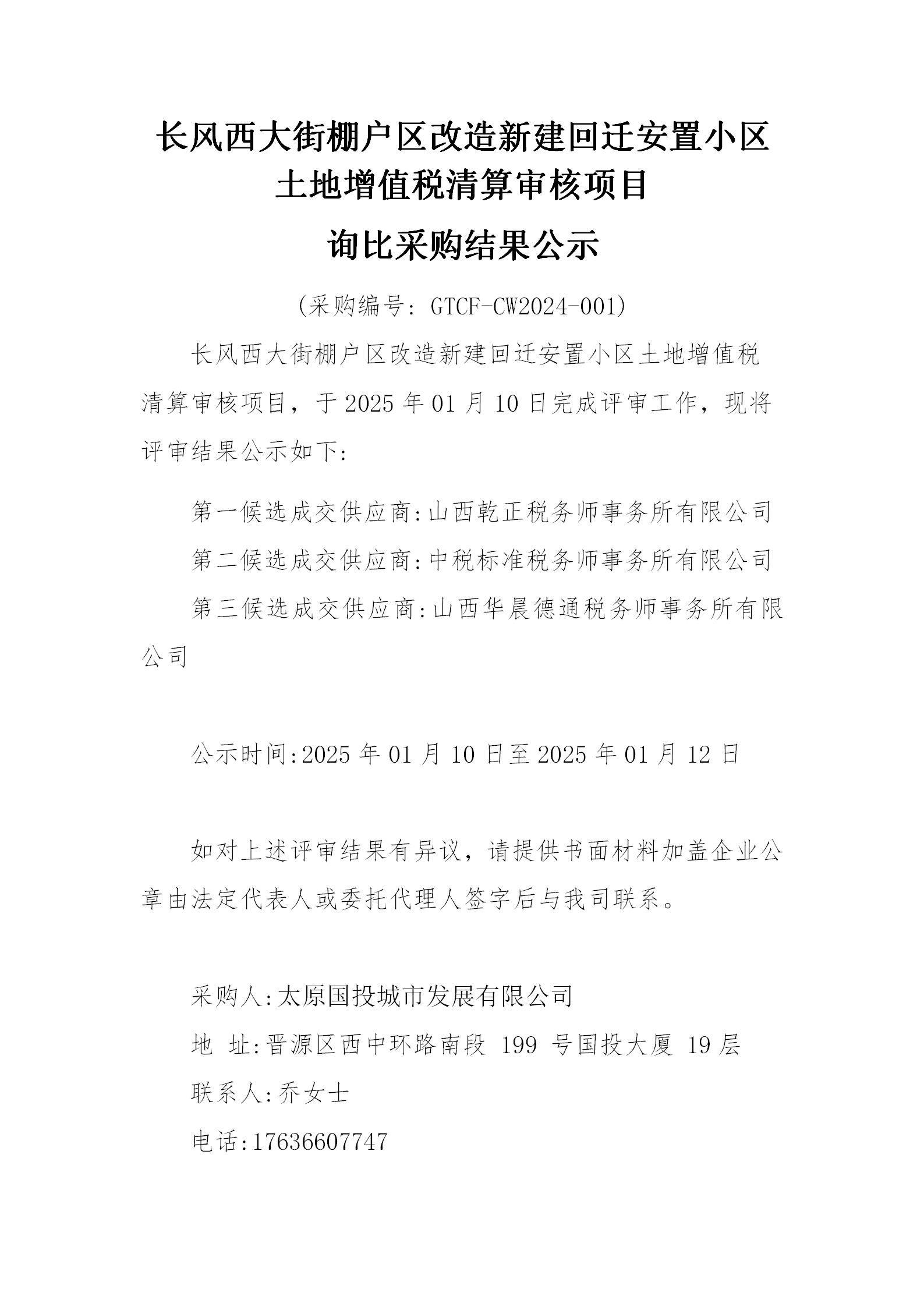 關于長風西大街棚戶區(qū)改造新建回遷安置小區(qū)土地增值稅清算審核項目詢比采購結果公示的發(fā)布申請