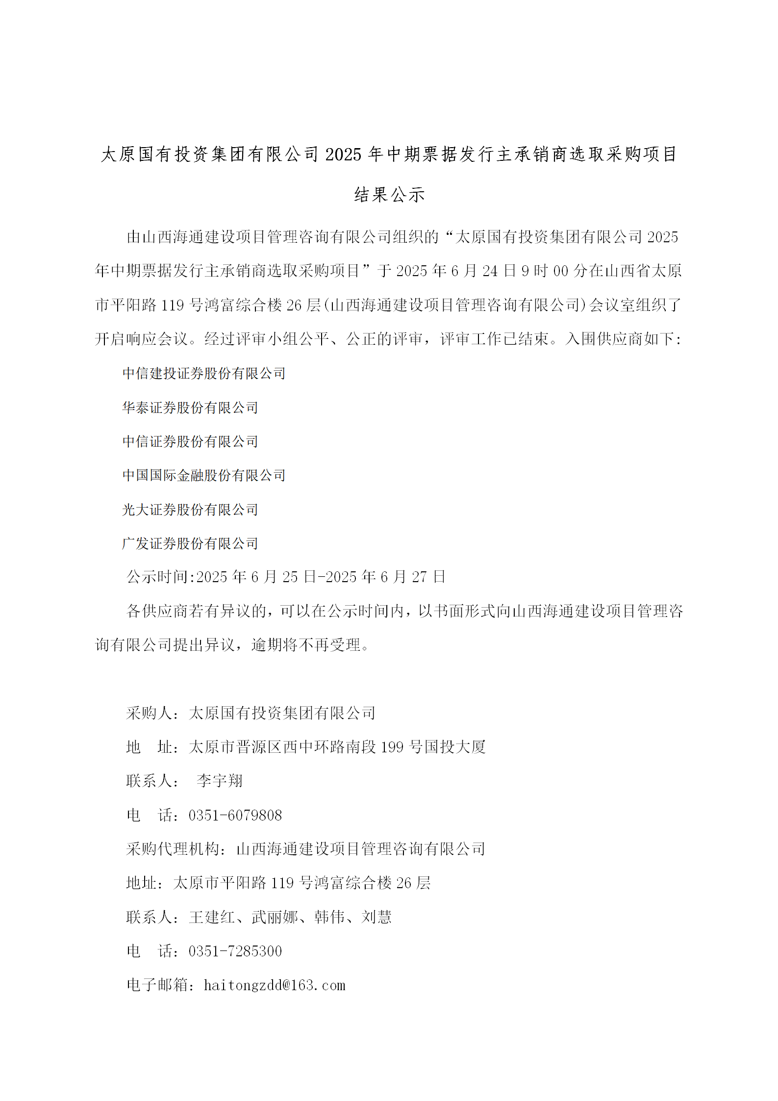 太原國(guó)有投資集團(tuán)有限公司2025年中期票據(jù)發(fā)行主承銷商選取采購(gòu)項(xiàng)目結(jié)果公示