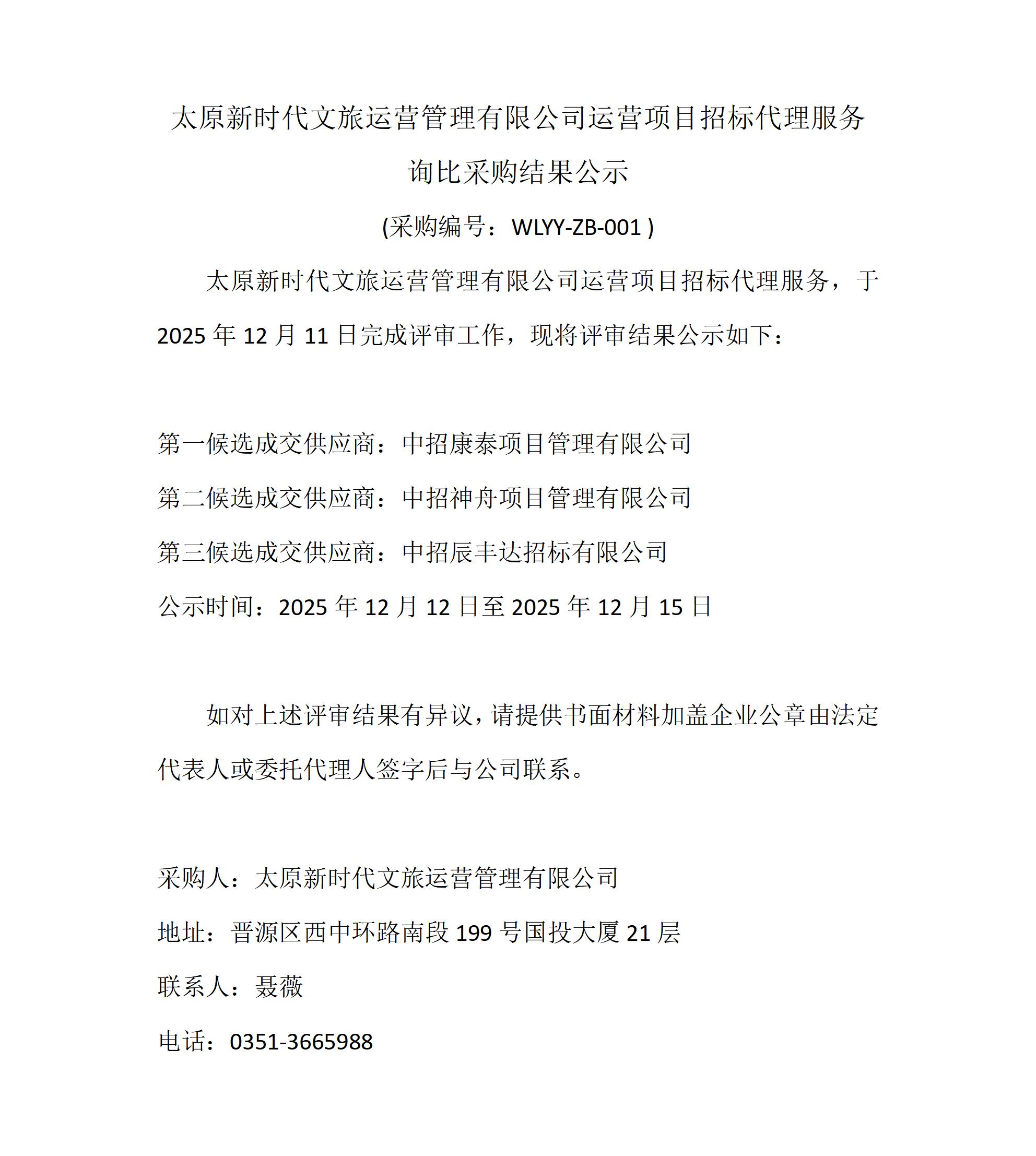 太原新時(shí)代文旅運(yùn)營(yíng)管理有限公司運(yùn)營(yíng)項(xiàng)目招標(biāo)代理服務(wù)采購項(xiàng)目詢比采購結(jié)果公示