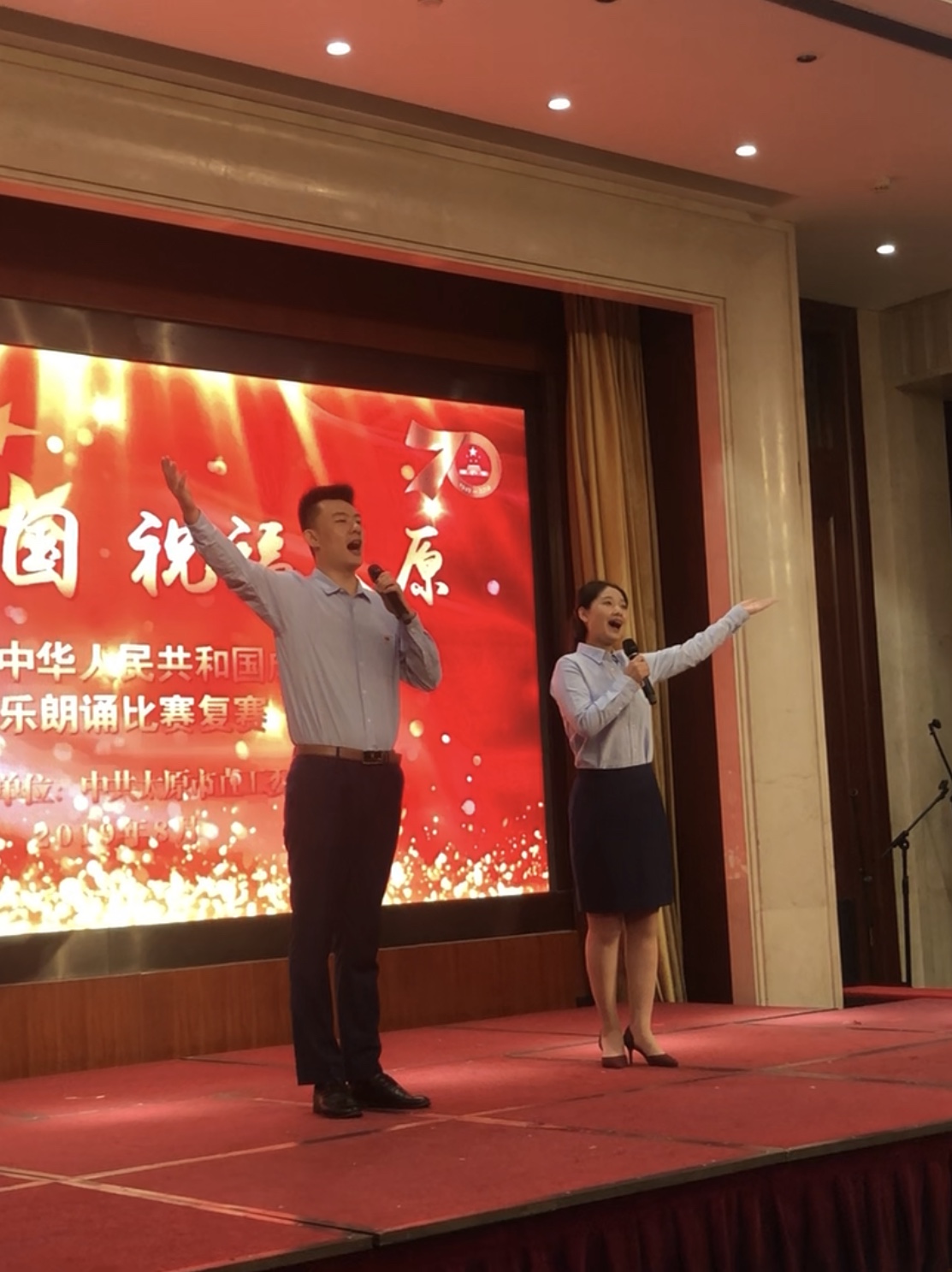 比賽分為上下午兩場(chǎng),全市總計(jì)41家單位參加比賽。經(jīng)過(guò)前期的老師指導(dǎo)與配合訓(xùn)練,現(xiàn)場(chǎng)我公司兩位同志精神飽滿、舉止大方,伴隨優(yōu)美的配樂(lè)緊緊圍繞“禮贊祖國(guó)、祝福太原”的主題,字正腔圓、高聲朗誦對(duì)祖國(guó)的熱愛(ài)之情。賽后,專業(yè)評(píng)委老師對(duì)于我公司選手給予了高度評(píng)價(jià)。