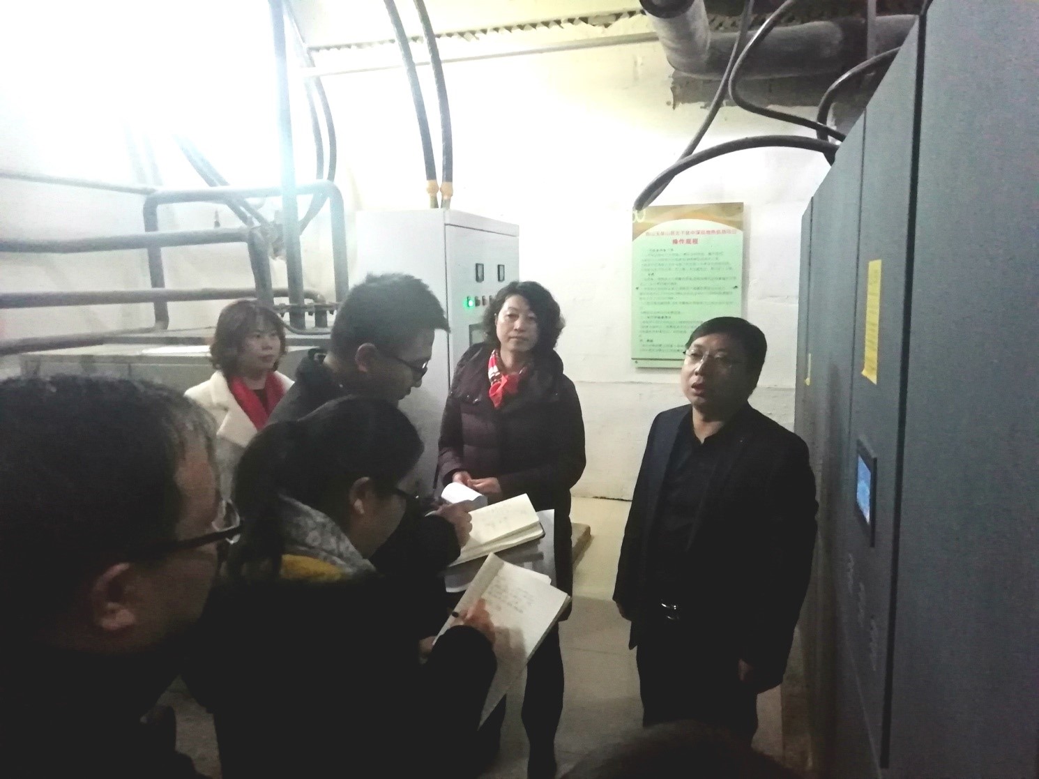 隨后,調(diào)研組參觀了能源站設(shè)備間、一號井井室及三號井井場,詳細詢問了供熱運營、地?zé)峋┕で闆r,并與我公司人員充分交流和討論了中深層無干擾地?zé)岬氖┕すに?、工程難度及項目進行中存在的問題等。